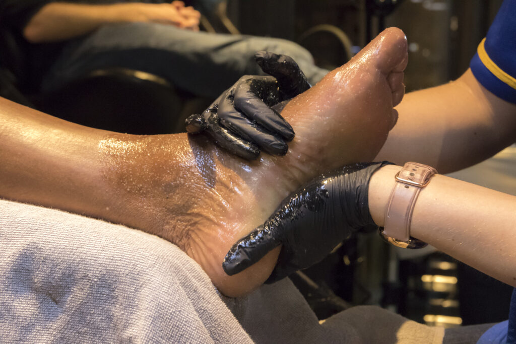 피로한 발을 위한 깊은 풋 마사지. 혈액 순환 촉진과 함께 편안한 휴식을 제공합니다.